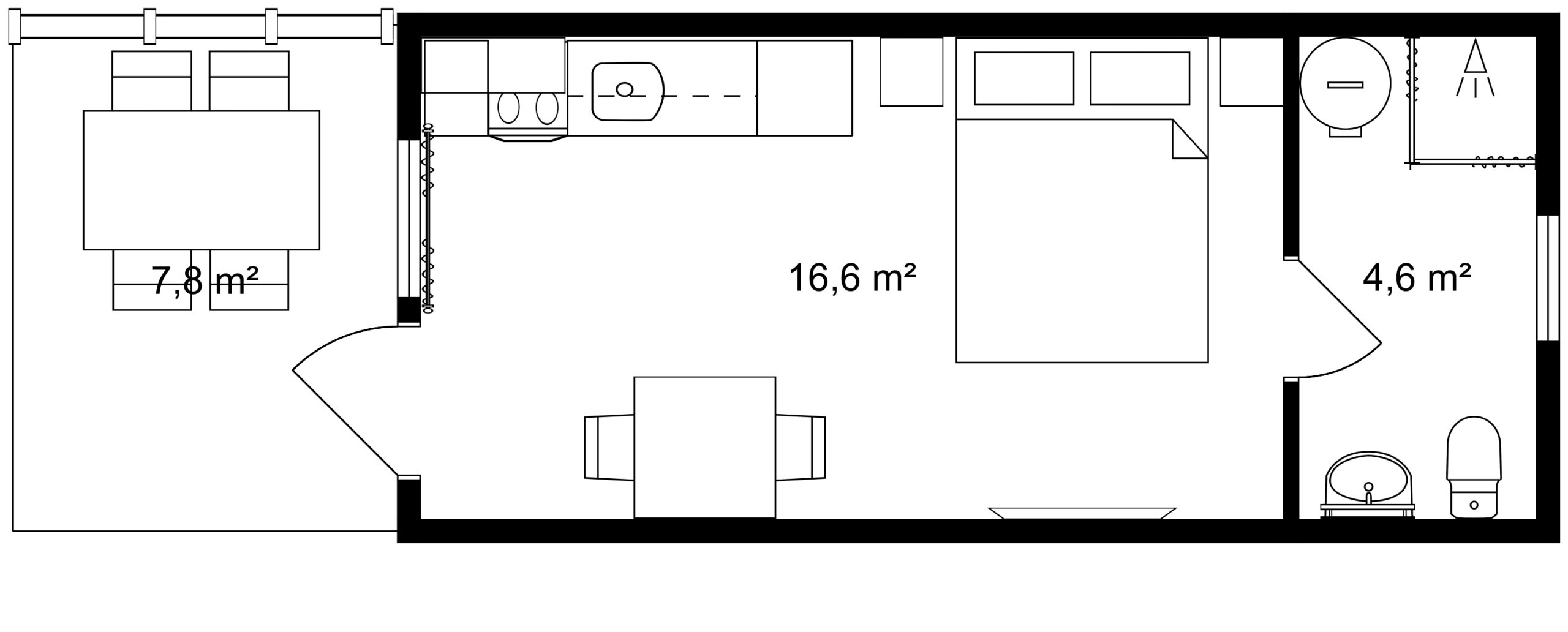 Stugan består av ett allrum med en delbar dubbelsäng, köksdel och badrum med dusch och toalett.